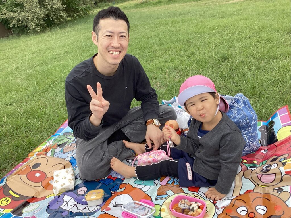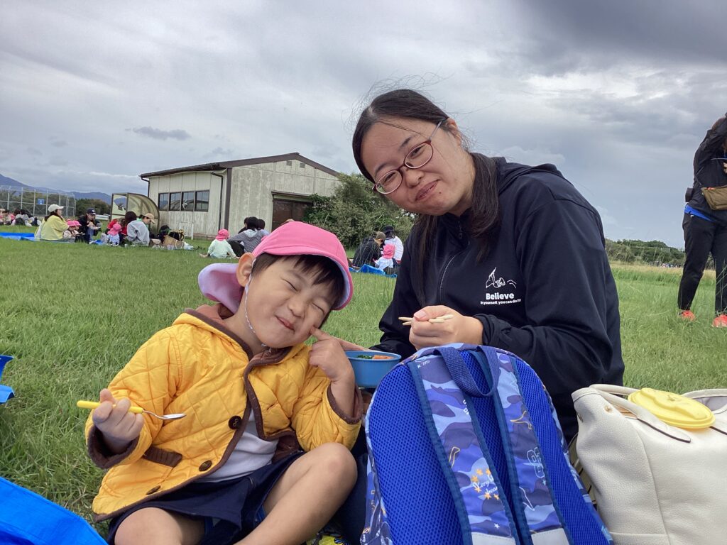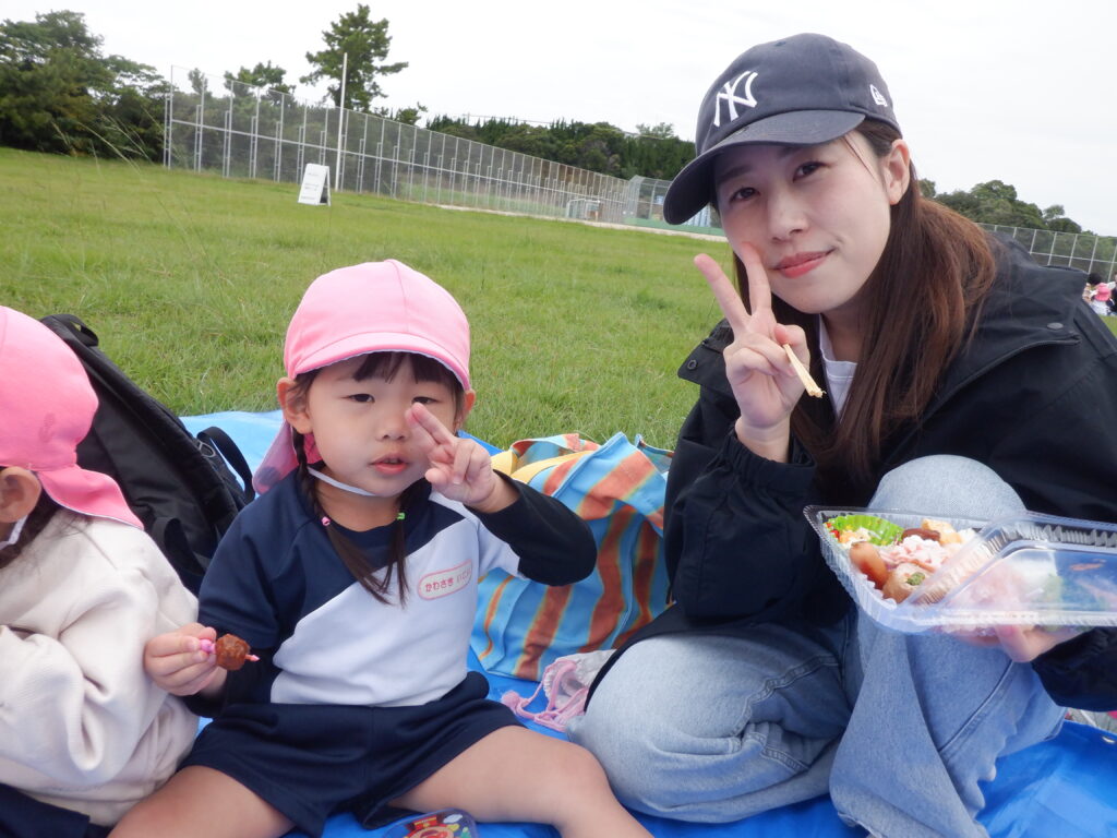 お昼は芝生の上で、お弁当タイム☆沢山身体を動かしてお腹が空いたようで‘‘待ってました’’と言わんばかりに美味しそうなお弁当をほおばっていましたよ。