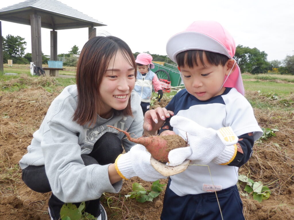 無事に取ることが出来るとニッコリ☺2歳児クラスの芋ほり遠足が楽しみですね☆