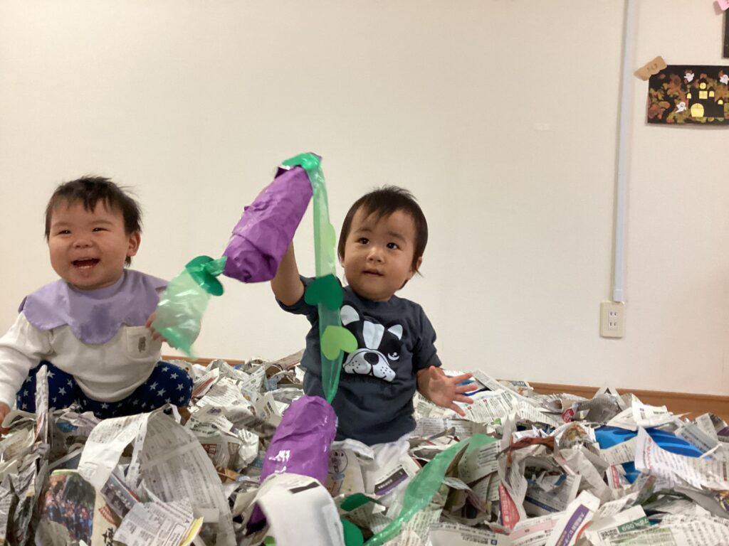 新聞紙と画用紙で見立てたお芋を探したり、保育者が引っ張って見せると「よいしょ、よいしょ」と一生懸命真似して引っ張る姿が見られました。