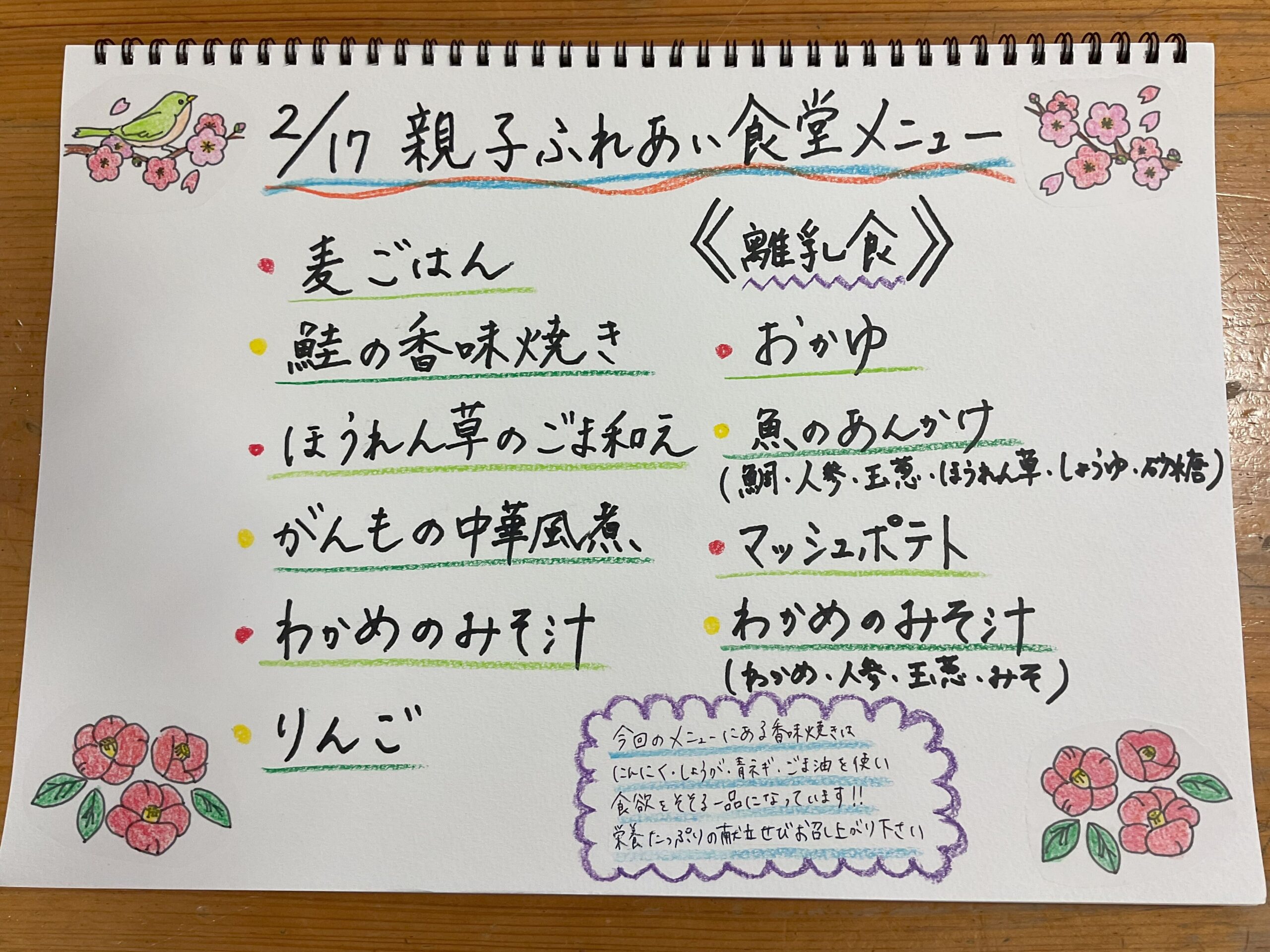 2月17日の親子ふれあい食堂は、園でも人気の鮭の香味焼きや、がんもどきの中華風煮を取り入れた献立でした。「鮭がふっくらしていておいしい」などという声をいただき嬉しく思います!(^^)!