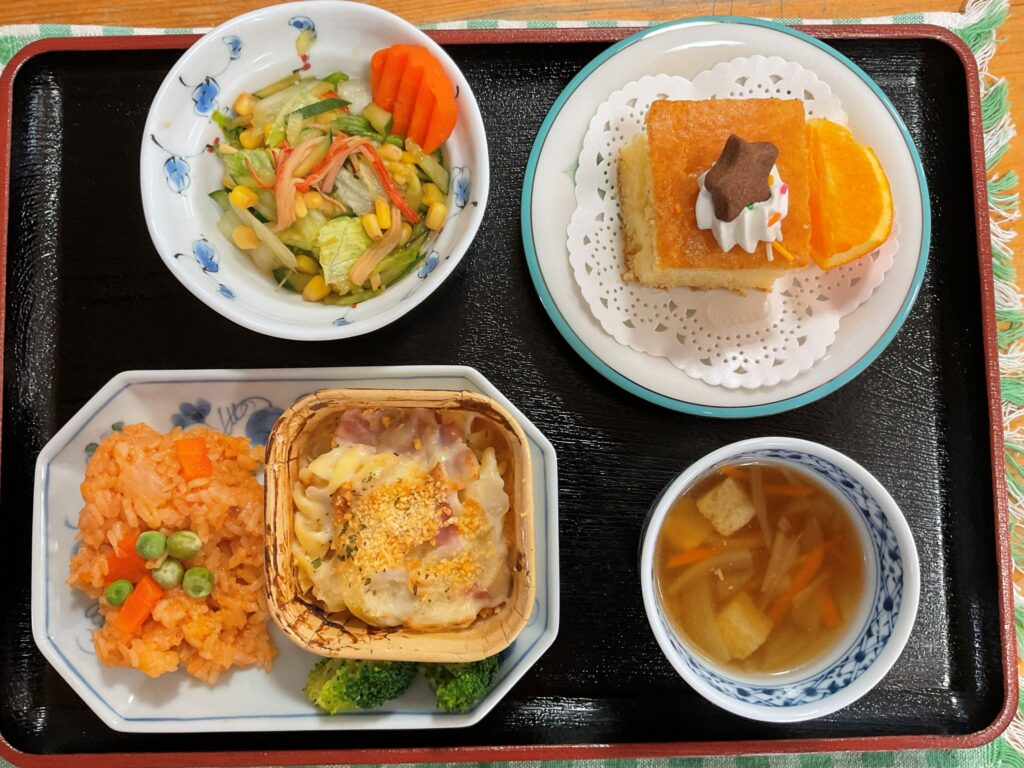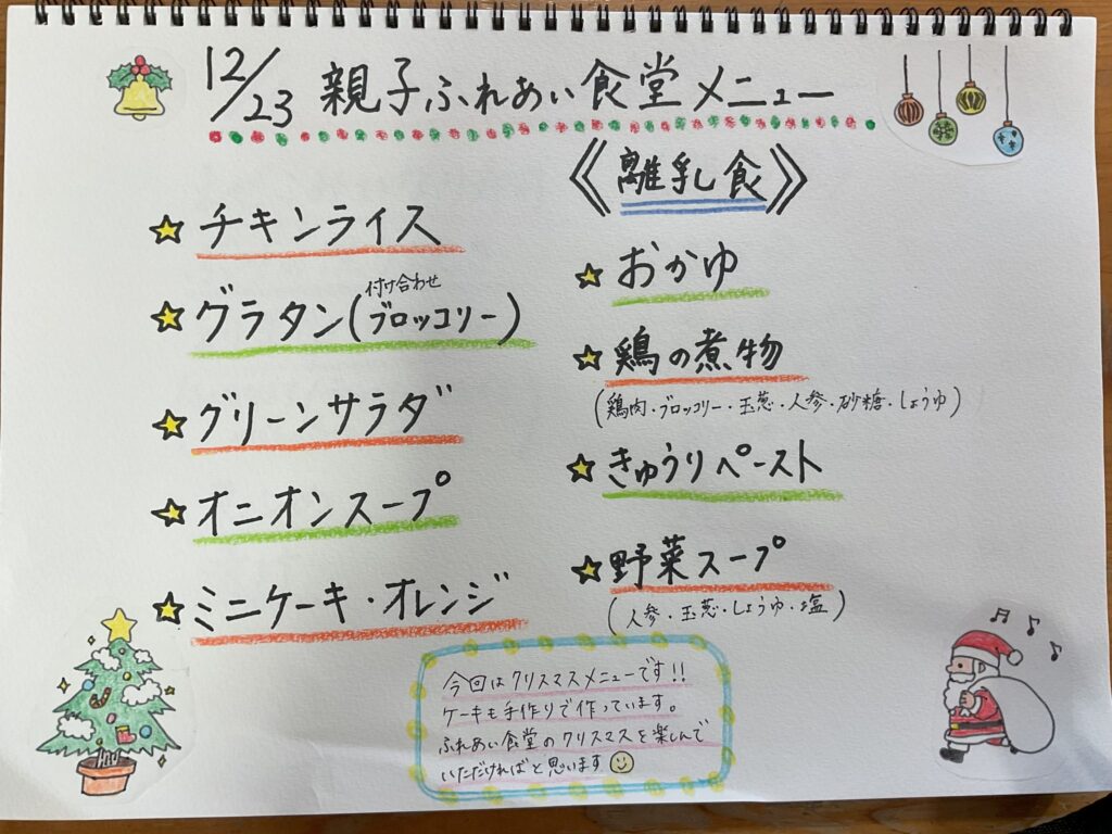 12月23日の親子ふれあい食堂は、クリスマスに近いという事でクリスマスにちなんだメニューにしました!手作りのクリスマスケーキ・グラタンなど親子で「おいしいね♪」と会話をしながら笑顔で食事をされていました(#^^#)